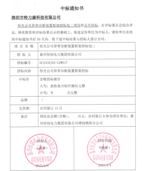 特力康中標(biāo)國網(wǎng)黑龍江送變電工程公司的2024年度第18次物資類競(jìng)爭(zhēng)性談判采購項(xiàng)目——慶陽驅(qū)鳥器物資框 特力康中標(biāo)國網(wǎng)甘肅省電力公司省管產(chǎn)業(yè)單位2024年第五次物資競(jìng)爭(zhēng)性談判授權(quán)采購項(xiàng)目 中標(biāo)喜訊:深圳市特力康科技有限公司成功入圍許繼集團(tuán)綜合能源公司輸電線路視頻在線監(jiān)測(cè)裝置模塊集采項(xiàng)目 中標(biāo)喜訊:特力康成功中標(biāo)國網(wǎng)重慶市電力公司渝中一片區(qū)項(xiàng)目 特力康成功中標(biāo)國網(wǎng)天津市電力公司2024年第二次?物?資招標(biāo)項(xiàng)目 特力康中標(biāo)國網(wǎng)安徽省電力有限公司蕪湖供電公司2024年3月非物質(zhì)采購項(xiàng)目 破解采空區(qū)隱患:山西電力裝特力康通用型監(jiān)測(cè)裝置,守鐵塔穩(wěn)運(yùn)行 四川電力用特力康架空輸電線路山火監(jiān)測(cè)裝置,筑牢林區(qū)輸電 “防火墻”? 遼寧電力啟用特力康多視角監(jiān)拍裝置,全維度守護(hù)輸電安全? 破解黃土高原沉降難題:山西電力用特力康北斗裝置守桿塔安全? 山東電力啟用特力康動(dòng)態(tài)版智能激光驅(qū)鳥器,動(dòng)態(tài)防控守護(hù)變電站安全? 湖南超高壓電力啟用特力康球機(jī) AI 監(jiān)測(cè)裝置,智能守護(hù)輸電通道安全? 廣西電力啟用特力康高壓電纜護(hù)層環(huán)流監(jiān)控設(shè)備,筑牢電纜安全防線? 寧夏配電線路安裝了我司防外破電子化智能警示牌