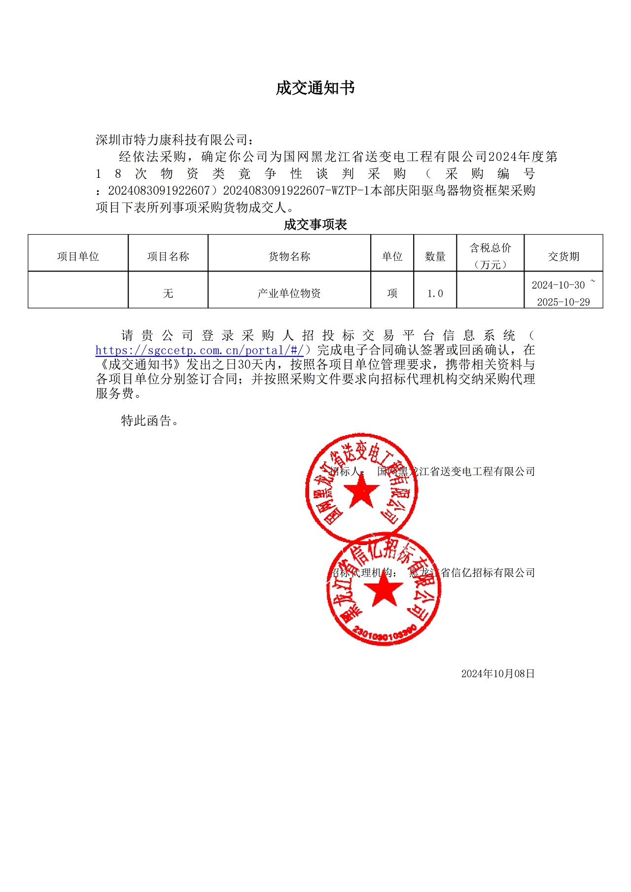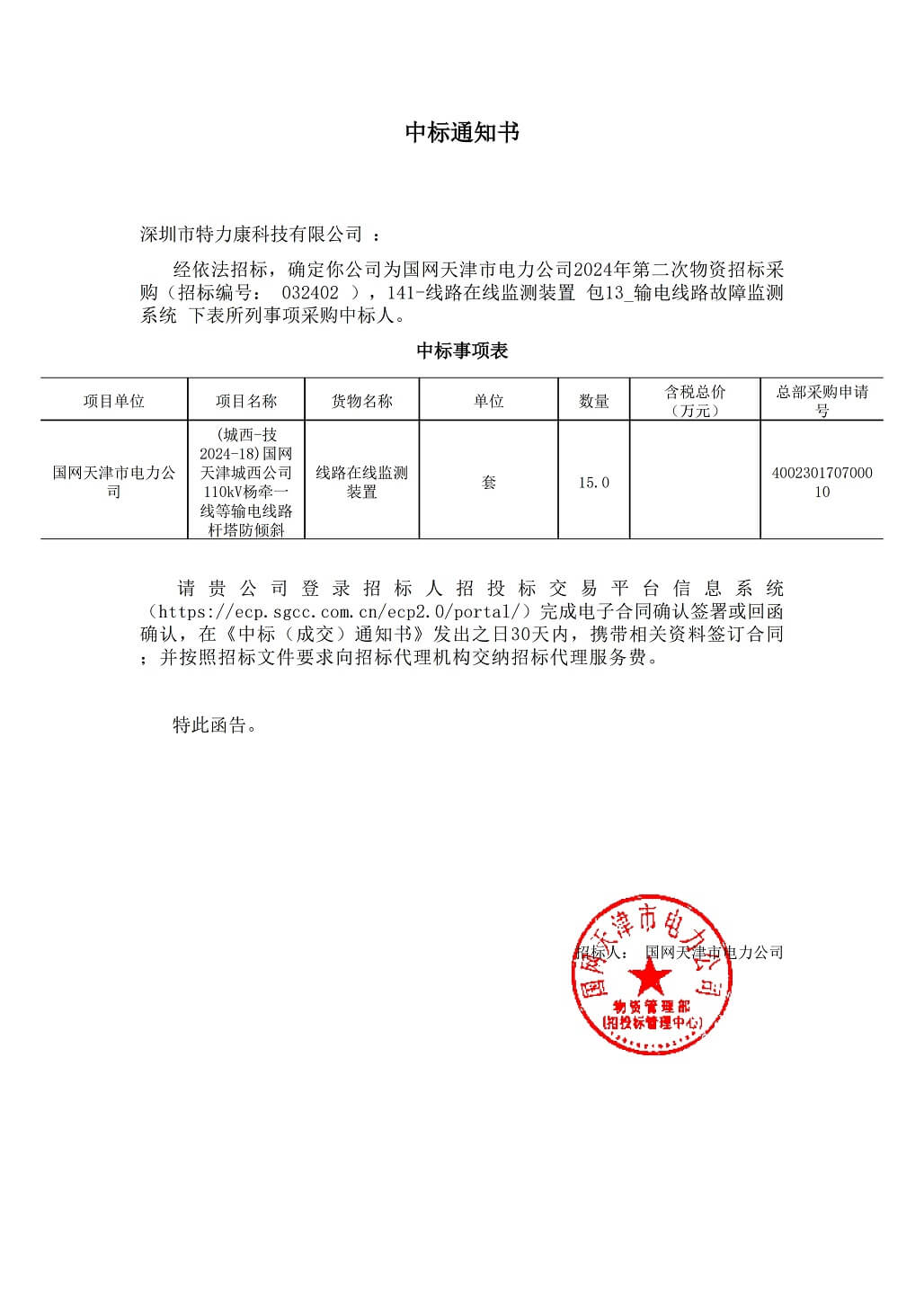 特力康中標(biāo)國(guó)網(wǎng)黑龍江送變電工程公司的2024年度第18次物資類(lèi)競(jìng)爭(zhēng)性談判采購(gòu)項(xiàng)目——慶陽(yáng)驅(qū)鳥(niǎo)器物資框 特力康中標(biāo)國(guó)網(wǎng)甘肅省電力公司省管產(chǎn)業(yè)單位2024年第五次物資競(jìng)爭(zhēng)性談判授權(quán)采購(gòu)項(xiàng)目 中標(biāo)喜訊:深圳市特力康科技有限公司成功入圍許繼集團(tuán)綜合能源公司輸電線路視頻在線監(jiān)測(cè)裝置模塊集采項(xiàng)目 中標(biāo)喜訊:特力康成功中標(biāo)國(guó)網(wǎng)重慶市電力公司渝中一片區(qū)項(xiàng)目 特力康成功中標(biāo)國(guó)網(wǎng)天津市電力公司2024年第二次?物?資招標(biāo)項(xiàng)目 特力康中標(biāo)國(guó)網(wǎng)安徽省電力有限公司蕪湖供電公司2024年3月非物質(zhì)采購(gòu)項(xiàng)目 破解采空區(qū)隱患:山西電力裝特力康通用型監(jiān)測(cè)裝置,守鐵塔穩(wěn)運(yùn)行 四川電力用特力康架空輸電線路山火監(jiān)測(cè)裝置,筑牢林區(qū)輸電 “防火墻”? 遼寧電力啟用特力康多視角監(jiān)拍裝置,全維度守護(hù)輸電安全? 破解黃土高原沉降難題:山西電力用特力康北斗裝置守桿塔安全? 山東電力啟用特力康動(dòng)態(tài)版智能激光驅(qū)鳥(niǎo)器,動(dòng)態(tài)防控守護(hù)變電站安全? 湖南超高壓電力啟用特力康球機(jī) AI 監(jiān)測(cè)裝置,智能守護(hù)輸電通道安全? 廣西電力啟用特力康高壓電纜護(hù)層環(huán)流監(jiān)控設(shè)備,筑牢電纜安全防線? 寧夏配電線路安裝了我司防外破電子化智能警示牌