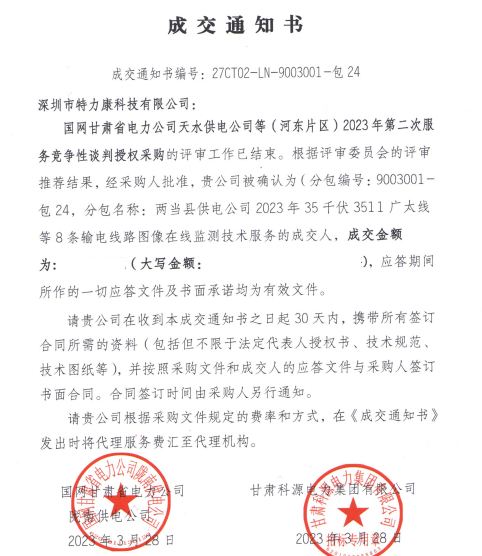 國網(wǎng)甘肅省電力公司天水供電公司等(河?xùn)|片區(qū)) 2023年第二次服務(wù)競爭性談判授權(quán)采購的評審工作已結(jié)束。根據(jù)評審委員會的評審?fù)扑]結(jié)果,經(jīng)采購人批準,我司被確認為(分包編號: 9003001-包24,分包名稱:兩當縣供電公司2023年35千伏3511廣太線等8條輸電線路圖像在線監(jiān)測技術(shù)服務(wù)的成交人,成交通知如下: