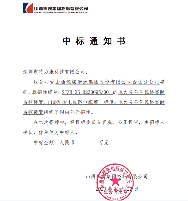 受山西焦煤能源集團股份有限公司西山分公司委托,就招標編號:SJZB-XS-H230095/001_的電力分公司線路實時監(jiān)控裝置、110KV輸電線路電纜第一標段:電力分公司線路實時監(jiān)控裝置組織了國內公開招標。在本次招標中,經評標委員會客觀、公正評審,由招標人確認,我單位為中標人。中標通知如下: