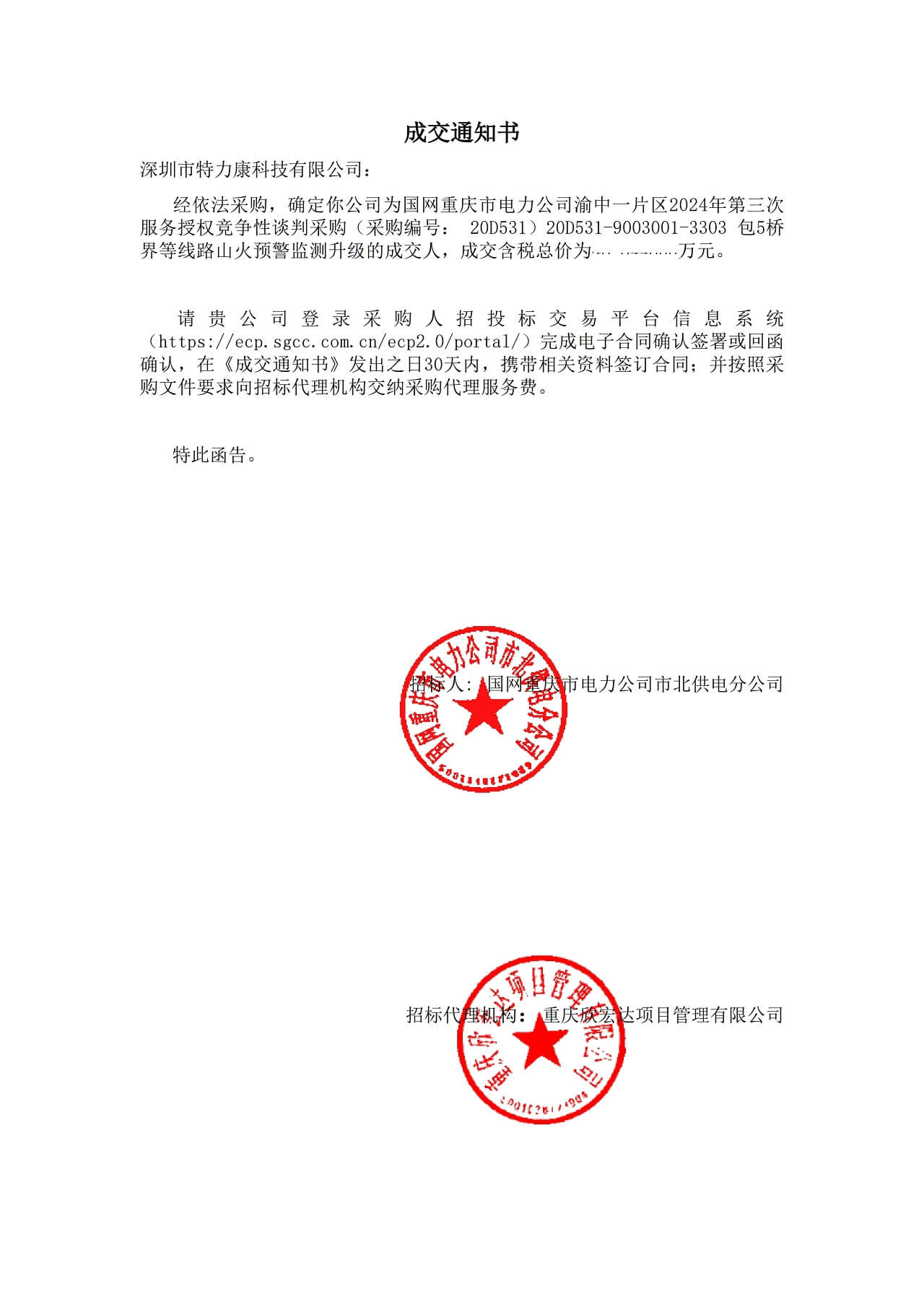 深圳,2024年4月26日——深圳市特力康科技有限公司(以下簡稱“特力康”)近日收到喜訊,經(jīng)過嚴格的評審和競爭性談判,我司成功中標國網(wǎng)重慶市電力公司渝中一片區(qū)2024年第三次服務授權競爭性談判采購項目(采購編號:20D531)中的20D531-9003001-3303包5橋界等線路山火預警監(jiān)測升級服務。