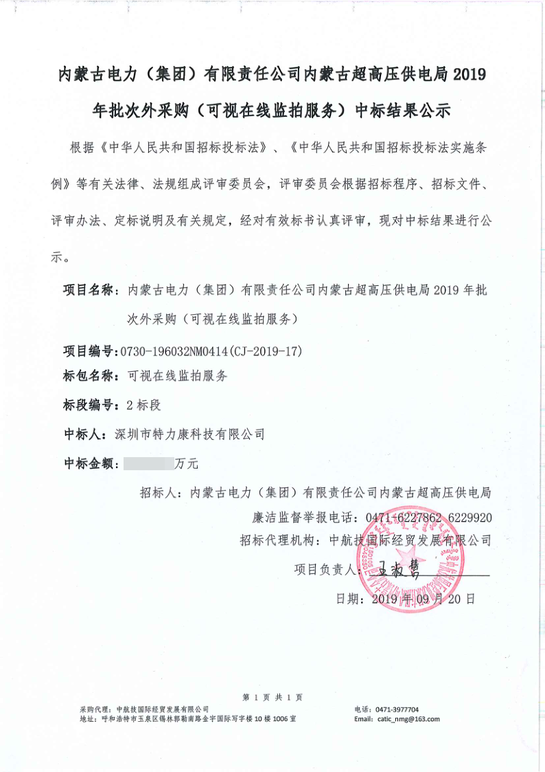 經(jīng)審委員會根據(jù)招標(biāo)程標(biāo)次評審、定標(biāo)說明及有關(guān)規(guī)定,經(jīng)對有效標(biāo)書認(rèn)真評審,確定我司為內(nèi)蒙古電力(集團(tuán))有限責(zé)任公司內(nèi)蒙古超高壓供電局2019年批次外采購(可視在線監(jiān)測服務(wù))項目中標(biāo)單位。