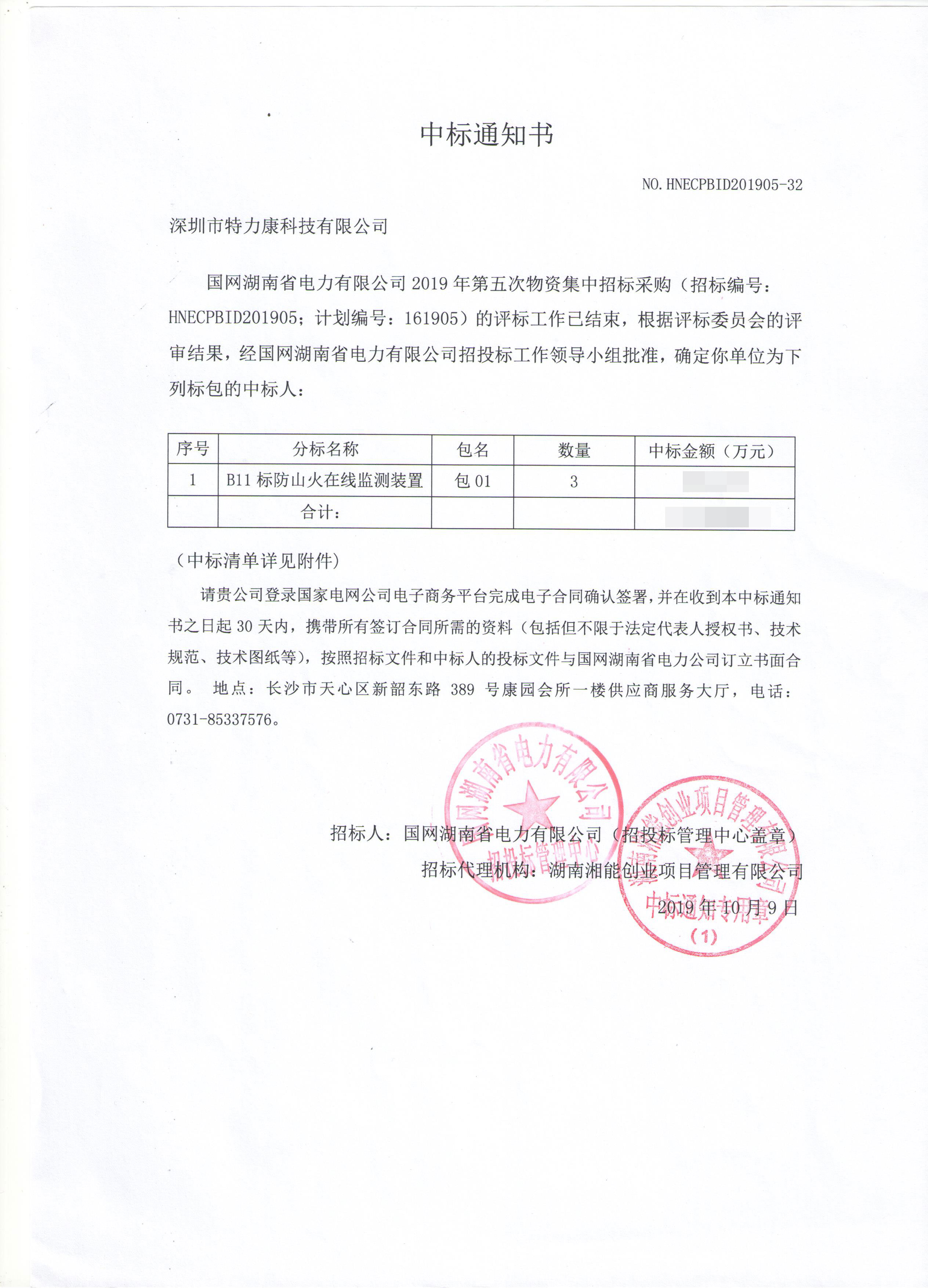 國網(wǎng)湖南省電力有限公司2019年第五次物資集中招標輸電線路防山火監(jiān)測裝置的評標工作已結(jié)束,根據(jù)評標審結(jié)果,經(jīng)國網(wǎng)湖南省電力有限公司招投標工作領(lǐng)導(dǎo)小組批準,確定我司深圳市特力康科技有限公司為列標包的中標人。