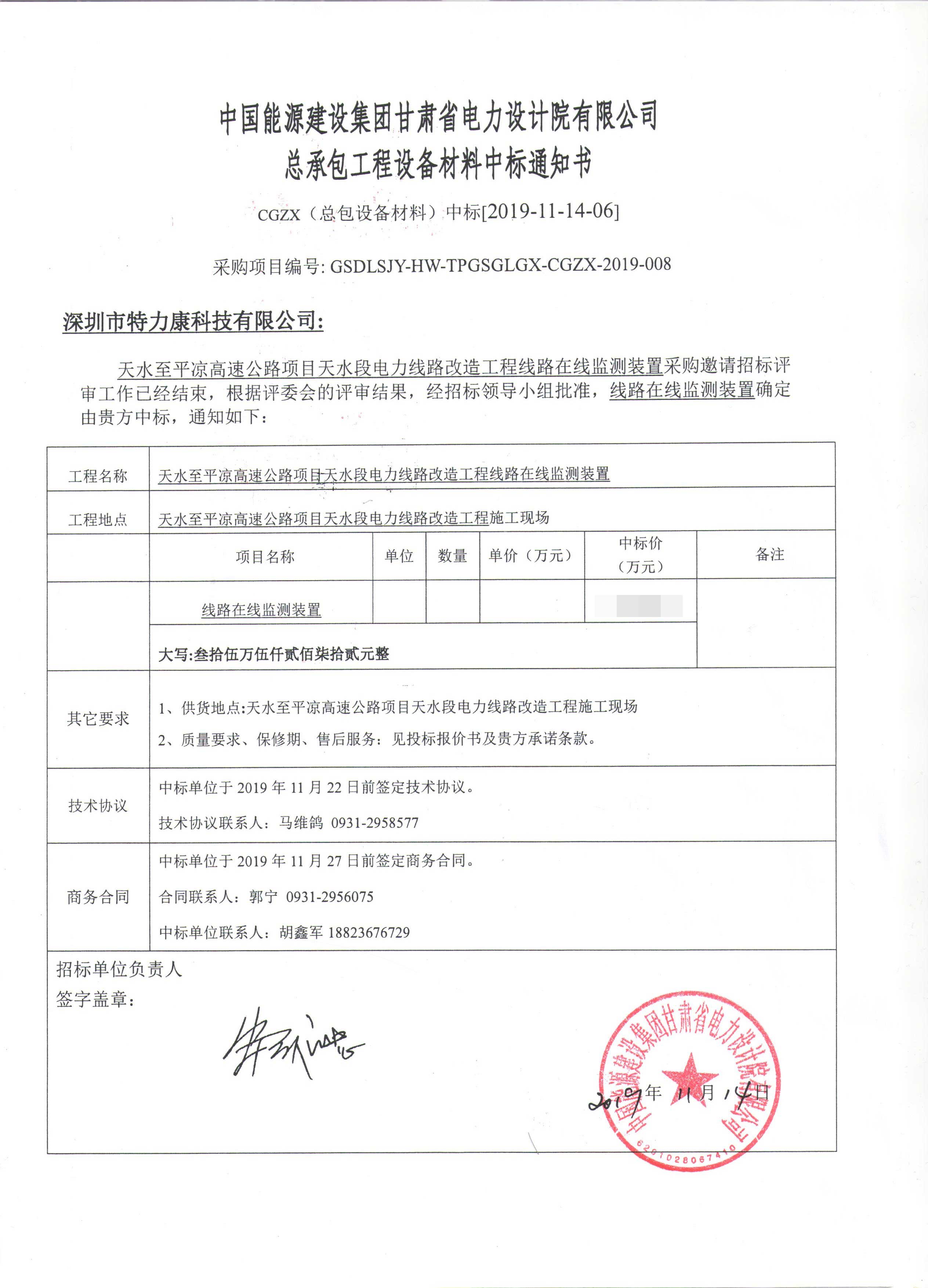 國網(wǎng)甘肅天水段電力線路改造工程線路在線監(jiān)測采購招標(biāo)評審工作已經(jīng)結(jié)束,根據(jù)評審委員會評審結(jié)果,招投標(biāo)領(lǐng)導(dǎo)小組批準(zhǔn),確定此次輸電線路在線監(jiān)測裝置由我司深圳市特力康科技有限公司中標(biāo),現(xiàn)將公告示下:
