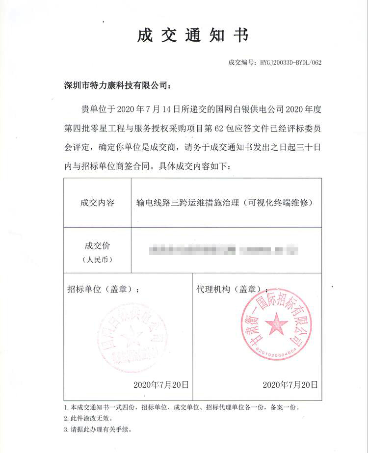 我司于2020年7月14日參加了國網(wǎng)白銀供電公司2020年度第四批零星工程與服務(wù)授權(quán)采購項(xiàng)目第62包輸電線路三跨運(yùn)維措施治理(可視化終端維修)的投標(biāo)工作,所遞交的應(yīng)答文件經(jīng)評標(biāo)委員會(huì)評定,確定我司(深圳市特力康科技有限公司)是成交商,具體成交內(nèi)容如下: