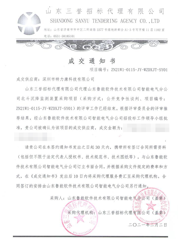 本次山東三譽(yù)招標(biāo)代理有限公司代理山東魯能軟件技術(shù)有限公司智能電氣分公司北斗沉降監(jiān)測(cè)裝置采購(gòu)項(xiàng)目(采購(gòu)方式:公開(kāi)競(jìng)爭(zhēng)性談判、項(xiàng)目編號(hào):ZN21W1-0115-JY-WZDXJT-SY01)的評(píng)審工作已經(jīng)結(jié)束。根據(jù)評(píng)審委員會(huì)的評(píng)審?fù)扑]結(jié)果,經(jīng)山東魯能軟件技術(shù)有限公司智能電氣分公司招投標(biāo)工作領(lǐng)導(dǎo)小組批準(zhǔn),我司(深圳市特力康科技有限公司)被確認(rèn)為該項(xiàng)目的成交供應(yīng)商,成交通知如下: