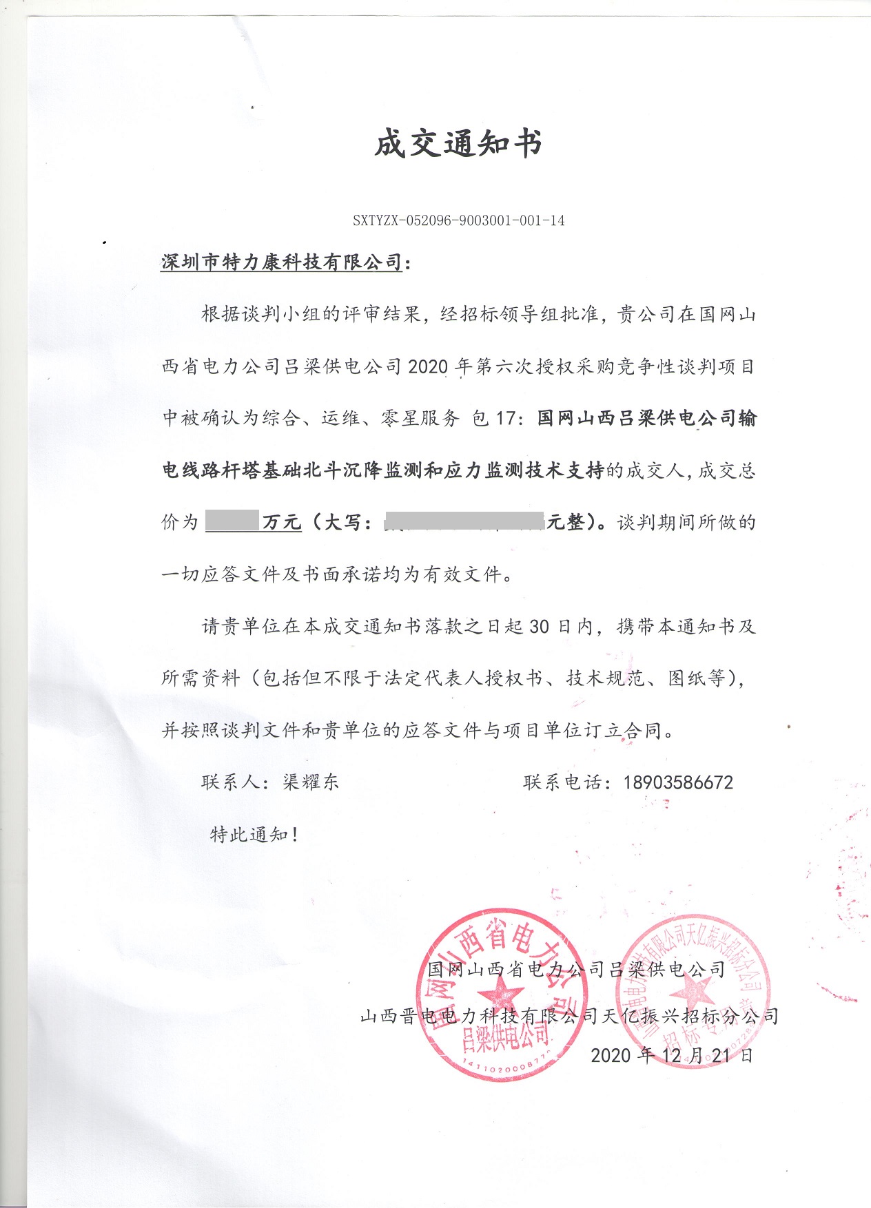 根據(jù)談判小組的評審結(jié)果,經(jīng)招標(biāo)領(lǐng)導(dǎo)組批準(zhǔn),貴公司在國網(wǎng)山西省電力公司呂梁供電公司2020年第六次授權(quán)采購競爭性談判項(xiàng)目中被確認(rèn)為綜合、運(yùn)維、零星服務(wù)包17:國網(wǎng)山西呂梁供電公司輸電線路桿塔基礎(chǔ)北斗沉降監(jiān)測和應(yīng)力監(jiān)測技術(shù)支持的成交人,成交通知如下:
