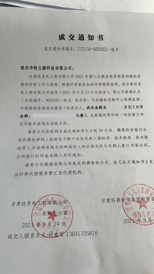 甘肅送變電工程有限公司2021年第八次服務競爭性談判授權采購的評審工作已結(jié)束。根據(jù)評審委員會的評審推薦結(jié)果,經(jīng)甘肅送變電工程有限公司批準(2021 年9月23日定標會),貴公司被確認為(分包編號: 9003001-包8, 包名稱:天水輸電運檢中心視頻監(jiān)測、桿塔傾斜監(jiān)測技術服務)的成交人,中標通知如下:
