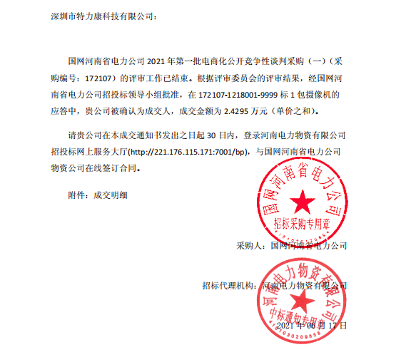 國網(wǎng)河南省電力公司2021年第一批電商化公開競爭性談判采購《- -) (果購編號: 172107) 的評審工作已結(jié)束。根據(jù)評審委員合的評審結(jié)果,經(jīng)國網(wǎng)河南省電力公司招投標(biāo)領(lǐng)導(dǎo)小組批準(zhǔn),在7210710101.9999標(biāo)1包攝像機的應(yīng)答中,責(zé)公司被確認為成交人,中標(biāo)通知如下:
