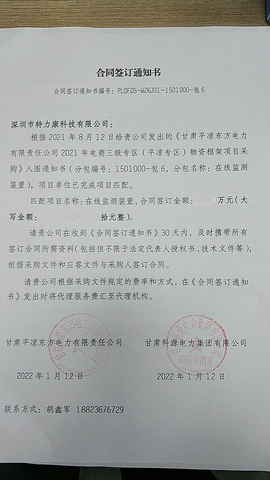 根據(jù)2021年8月12日給貴公司發(fā)出的《甘肅平?jīng)鰱|方電力有限責(zé)任公司2021年電商三級專區(qū)(平?jīng)鰧^(qū))物資框架項(xiàng)目采購》入圍通知書(分包編號: 1501000-包6, 分包名稱:在線監(jiān)測裝置,項(xiàng)目單位已完成項(xiàng)目匹配。成交通知如下: