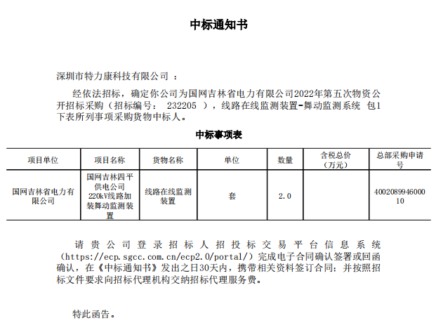 經(jīng)依法招標(biāo),確定我司(深圳特力康)為國(guó)網(wǎng)吉林省電力有限公司2022年第五次物資公開(kāi)招標(biāo)采購(gòu)(招標(biāo)編號(hào): 232205 ),線(xiàn)路在線(xiàn)監(jiān)測(cè)裝置-舞動(dòng)監(jiān)測(cè)系統(tǒng)包1下表所列事項(xiàng)采購(gòu)貨物中標(biāo)人。中標(biāo)通知如下: