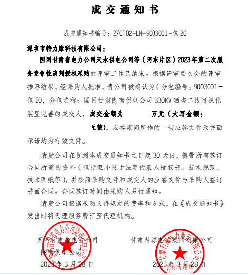 特力康中標(biāo)國網(wǎng)黑龍江送變電工程公司的2024年度第18次物資類競(jìng)爭(zhēng)性談判采購項(xiàng)目——慶陽驅(qū)鳥器物資框 特力康中標(biāo)國網(wǎng)甘肅省電力公司省管產(chǎn)業(yè)單位2024年第五次物資競(jìng)爭(zhēng)性談判授權(quán)采購項(xiàng)目 中標(biāo)喜訊:深圳市特力康科技有限公司成功入圍許繼集團(tuán)綜合能源公司輸電線路視頻在線監(jiān)測(cè)裝置模塊集采項(xiàng)目 中標(biāo)喜訊:特力康成功中標(biāo)國網(wǎng)重慶市電力公司渝中一片區(qū)項(xiàng)目 特力康成功中標(biāo)國網(wǎng)天津市電力公司2024年第二次?物?資招標(biāo)項(xiàng)目 特力康中標(biāo)國網(wǎng)安徽省電力有限公司蕪湖供電公司2024年3月非物質(zhì)采購項(xiàng)目 破解采空區(qū)隱患:山西電力裝特力康通用型監(jiān)測(cè)裝置,守鐵塔穩(wěn)運(yùn)行 四川電力用特力康架空輸電線路山火監(jiān)測(cè)裝置,筑牢林區(qū)輸電 “防火墻”? 遼寧電力啟用特力康多視角監(jiān)拍裝置,全維度守護(hù)輸電安全? 破解黃土高原沉降難題:山西電力用特力康北斗裝置守桿塔安全? 山東電力啟用特力康動(dòng)態(tài)版智能激光驅(qū)鳥器,動(dòng)態(tài)防控守護(hù)變電站安全? 湖南超高壓電力啟用特力康球機(jī) AI 監(jiān)測(cè)裝置,智能守護(hù)輸電通道安全? 廣西電力啟用特力康高壓電纜護(hù)層環(huán)流監(jiān)控設(shè)備,筑牢電纜安全防線? 寧夏配電線路安裝了我司防外破電子化智能警示牌